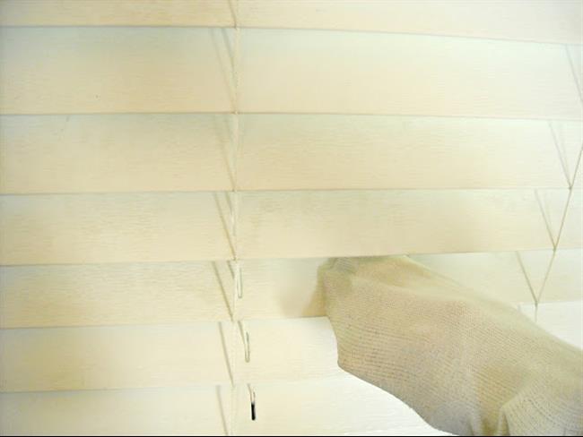 Com uma solução de água e vinagre e uma meia nas mãos, como uma luva, você pode tirar toda a sujeira da persiana. Na outra mão, dá para colocar outra meia e ir secando a mistura da cortina.
